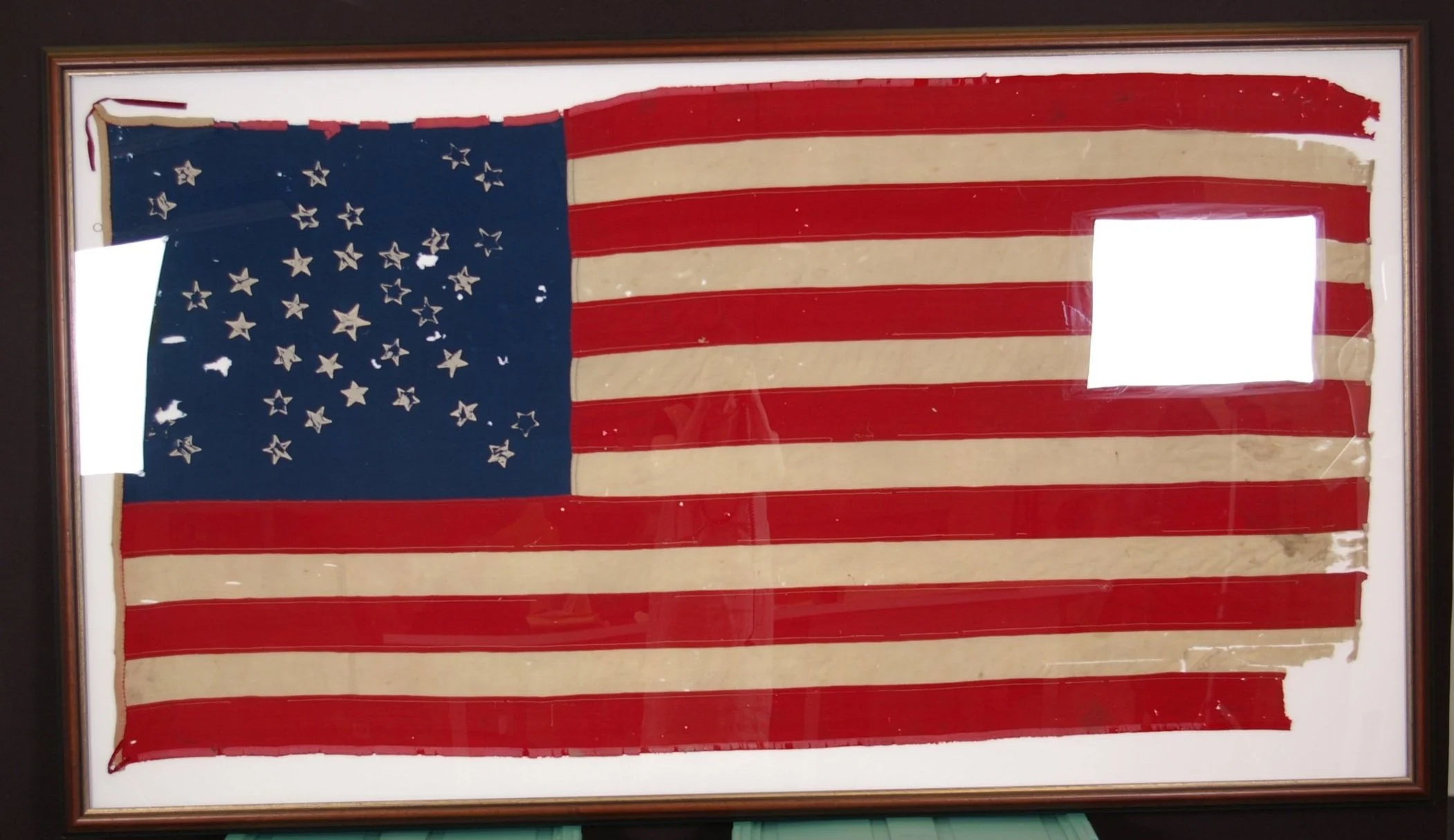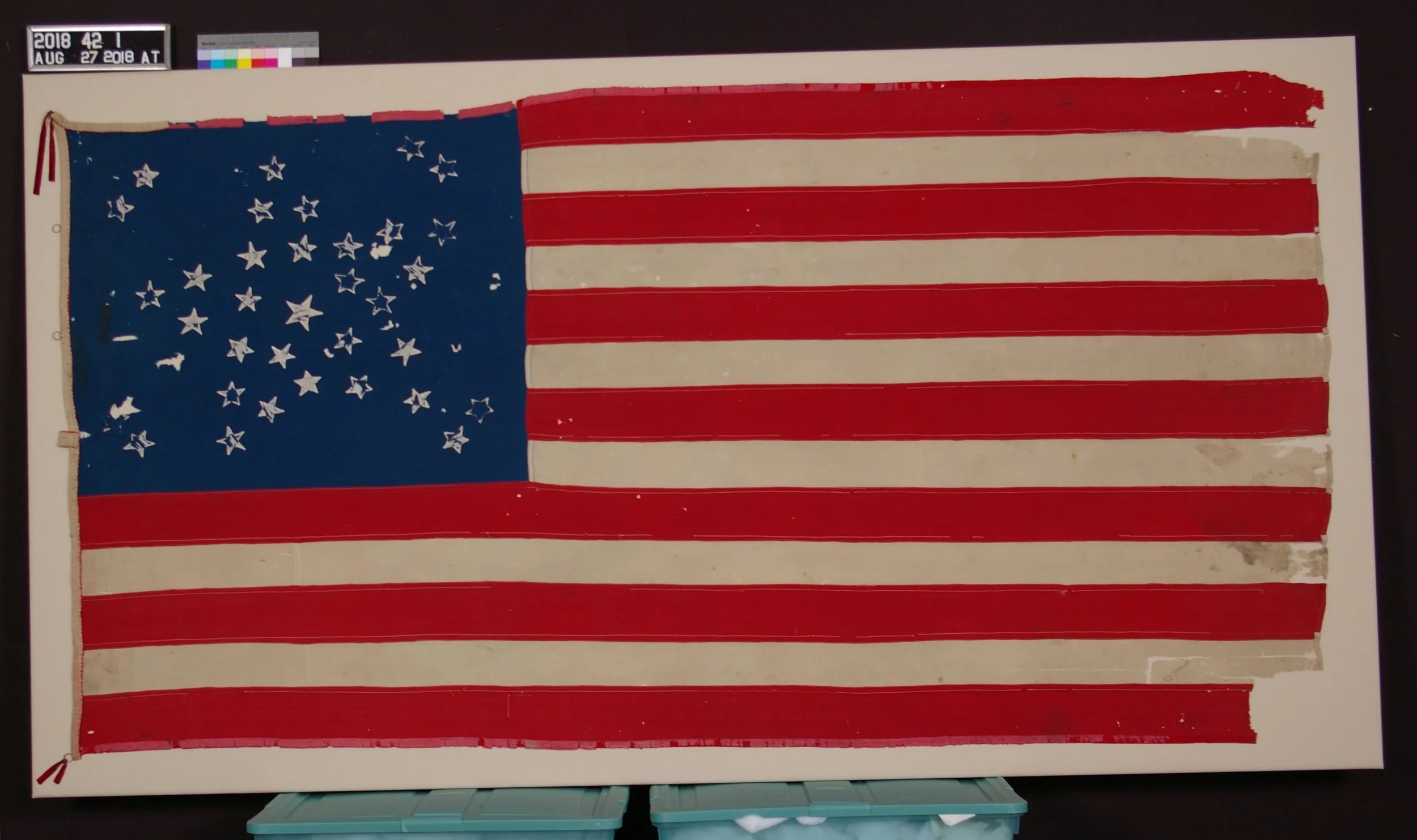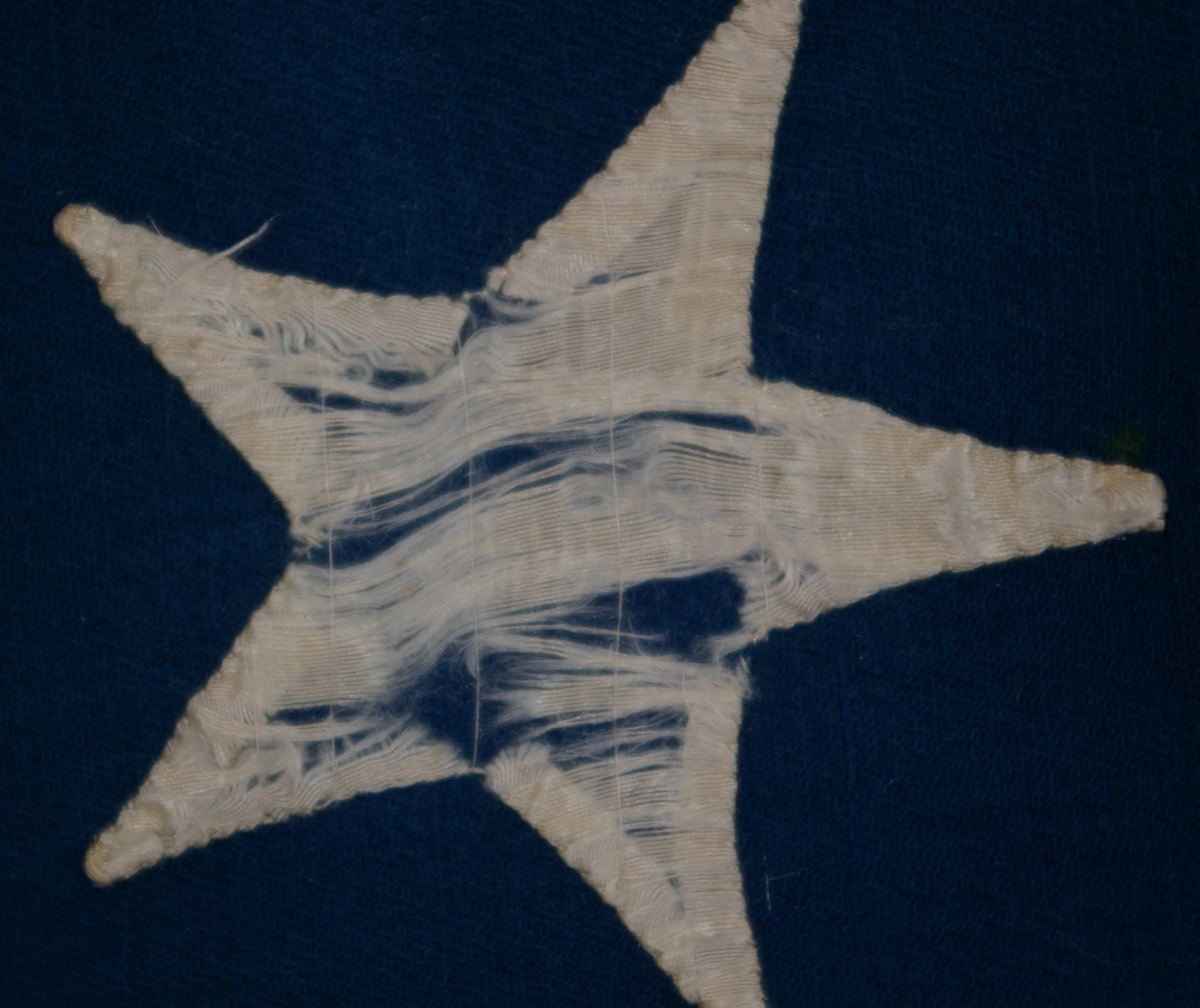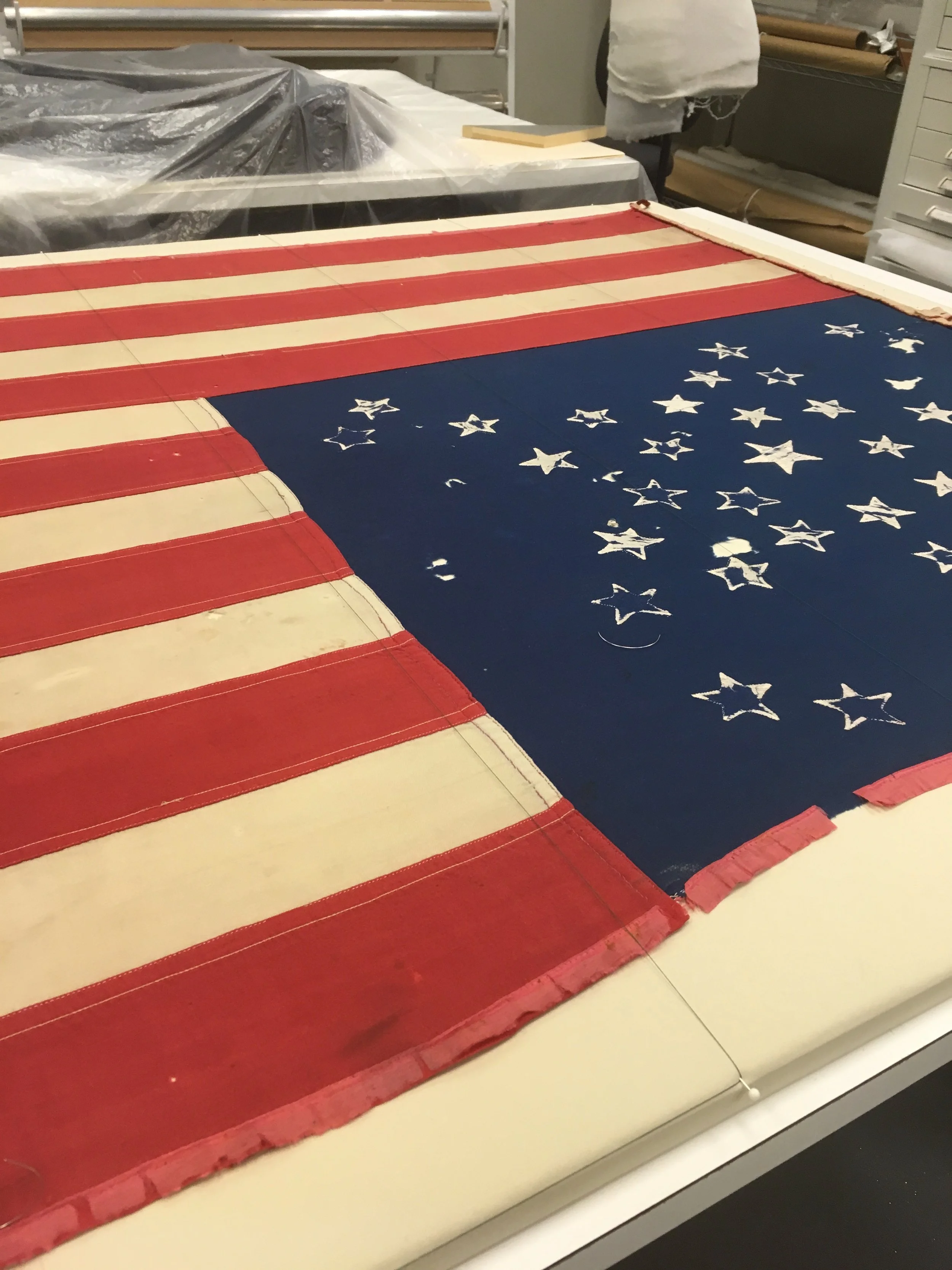 The flag came into the collection mounted in a heavy frame under glass. The flag was directly mounted onto a thick paper board by way of plastic garment tags. These were incredibly numerous and hard to see. Once the flag was removed, a custom-made aluminum honeycomb board was padded and covered with show fabric. The flag was then stitched down to the mount, taking care to consolidate fragile areas.