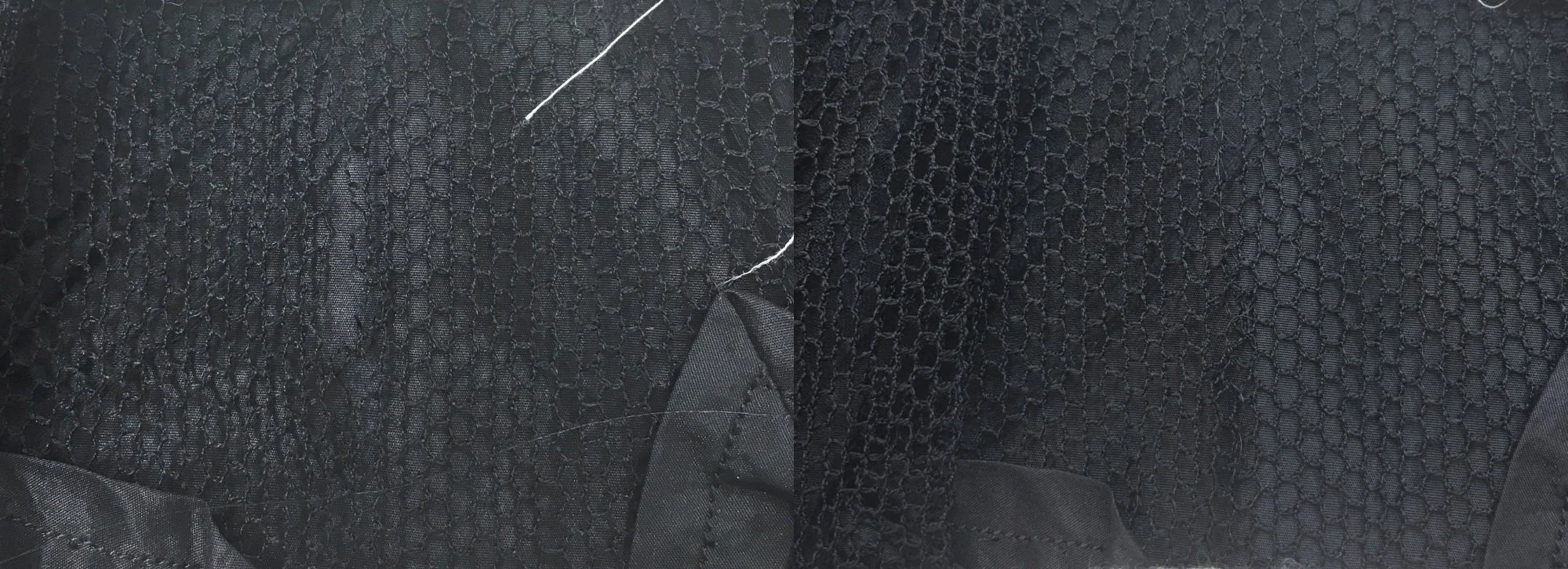 Because of the age and fragility of the silk net, small tears appeared throughout the bodice. These were consolidated using Skala thread in black to invisibly stitch the tears back together.