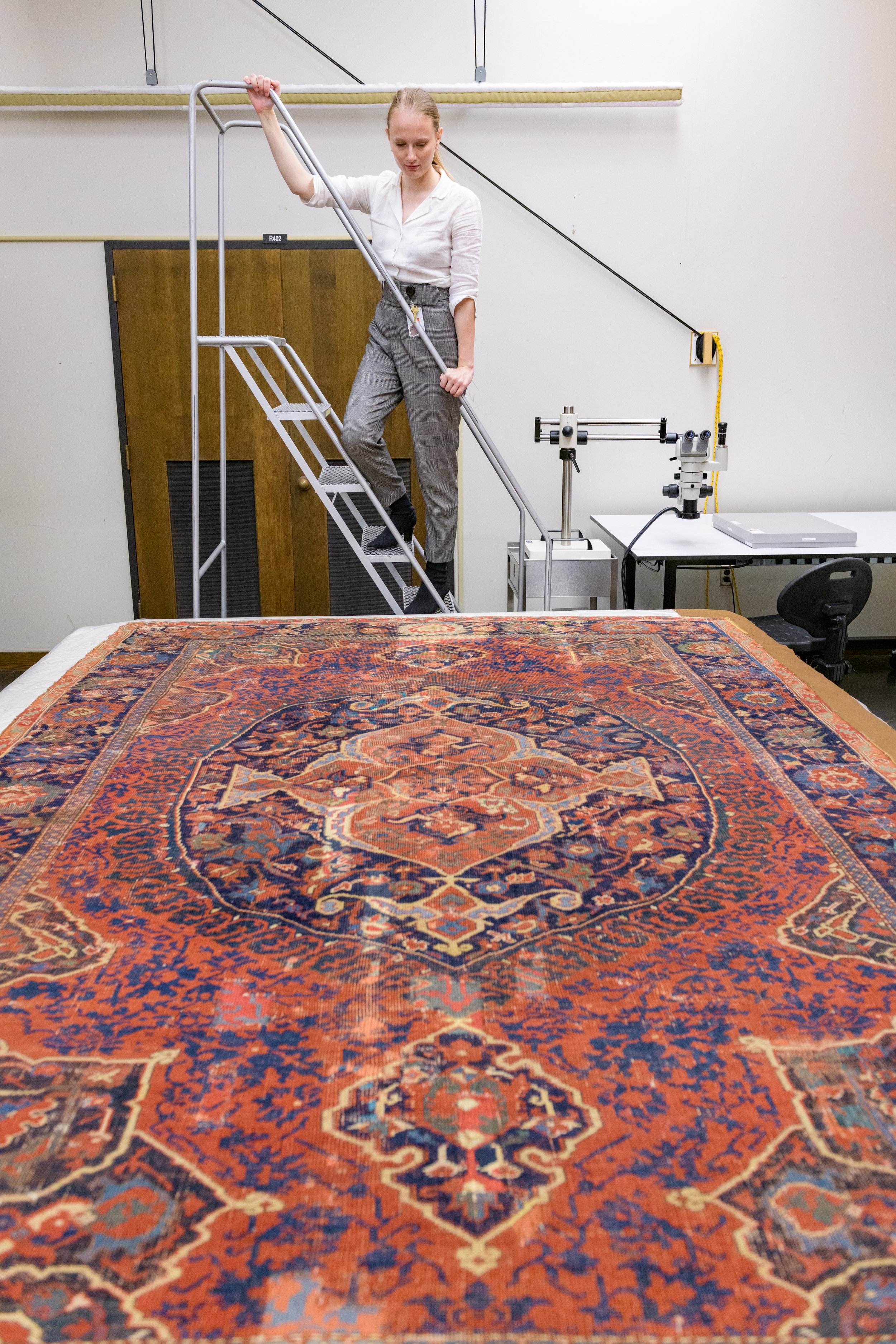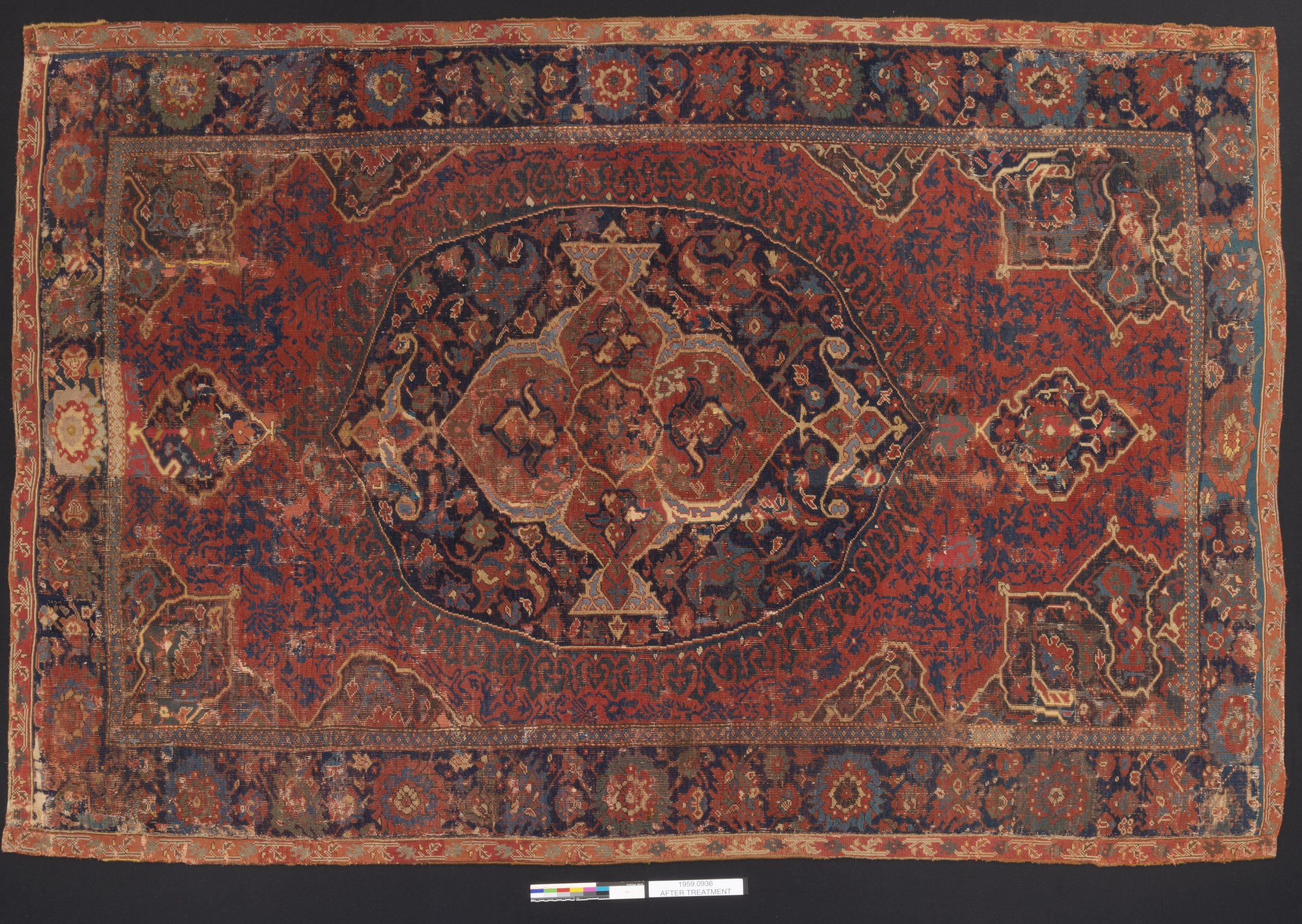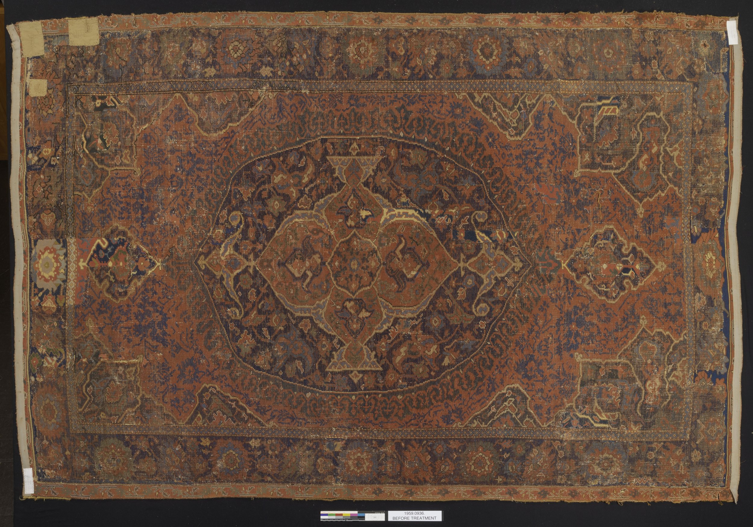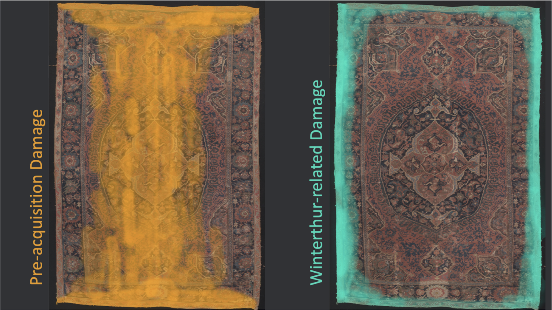 The rug was thoroughly researched and surveyed before any treatment was proposed. The 400 hundred-year-old handmade rug had many campaigns of darning, patches, and stabilization both in and out of the Winterthur collection. Fellow Second Year Fellow Riley Cruttenden made these wonderful graphics below showing the areas of wear before and after the rug’s accession into the Winterthur Collection.