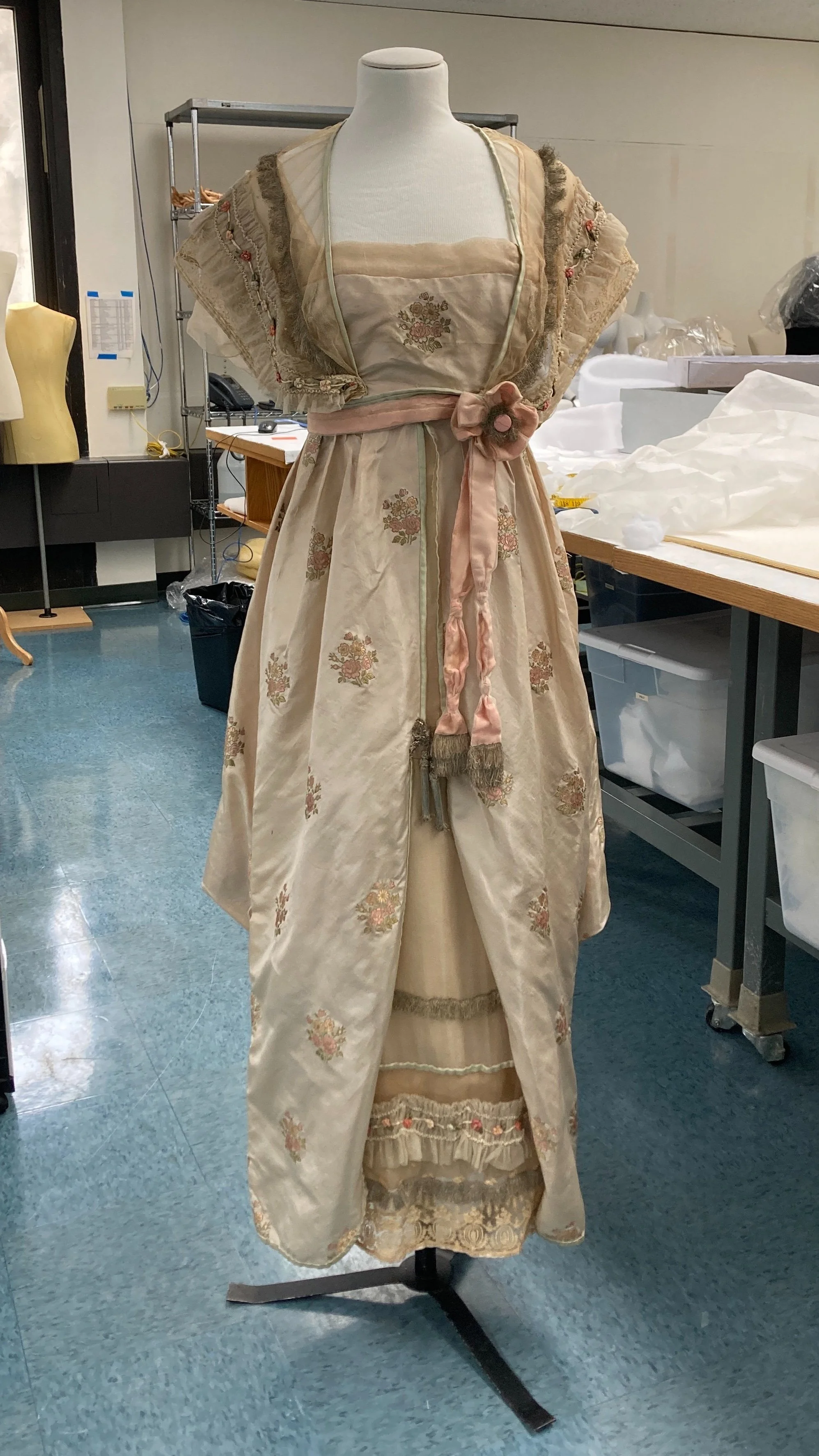 This lovely Lucille evening gown has been featured in several FIT exhibitions including recently in Ravishing: The Rose in Fashion and was slated for Designing Women: Fashion Creators and their Interiors although it was ultimately cut and was not exhibited. Since this dress is from 1914 and has been exhibited quite a bit, the interior weighted silk lining is starting to fracture. Thus the object needed a full bodice lining support as well as a few other small patch repairs to the back skirt opening.