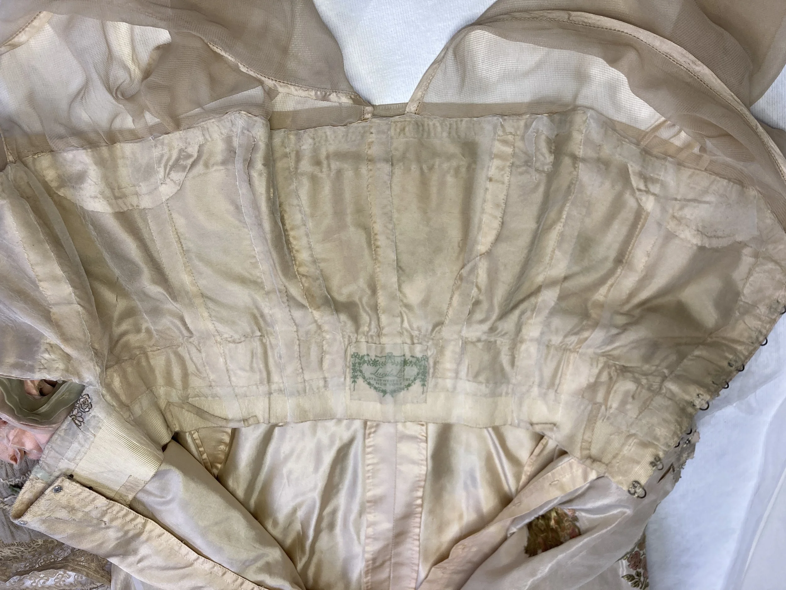 Once all of the pieces were stitched together, the seam allowances were pinked, the lining was pinned in with entomology pins, and the center back seam of the chiffon lining was tacked to the original. The top edge of the lining was folded under and tacked and the bottom was folded under and tacked on the center front and folded under the petershim for the rest of the bodice. All was tacked in place with herringbone stitches. Holes were cut to facilitate the use of the hooks and eyes. Laid and couch stitches were used to consolidate the splits on the PR lining.