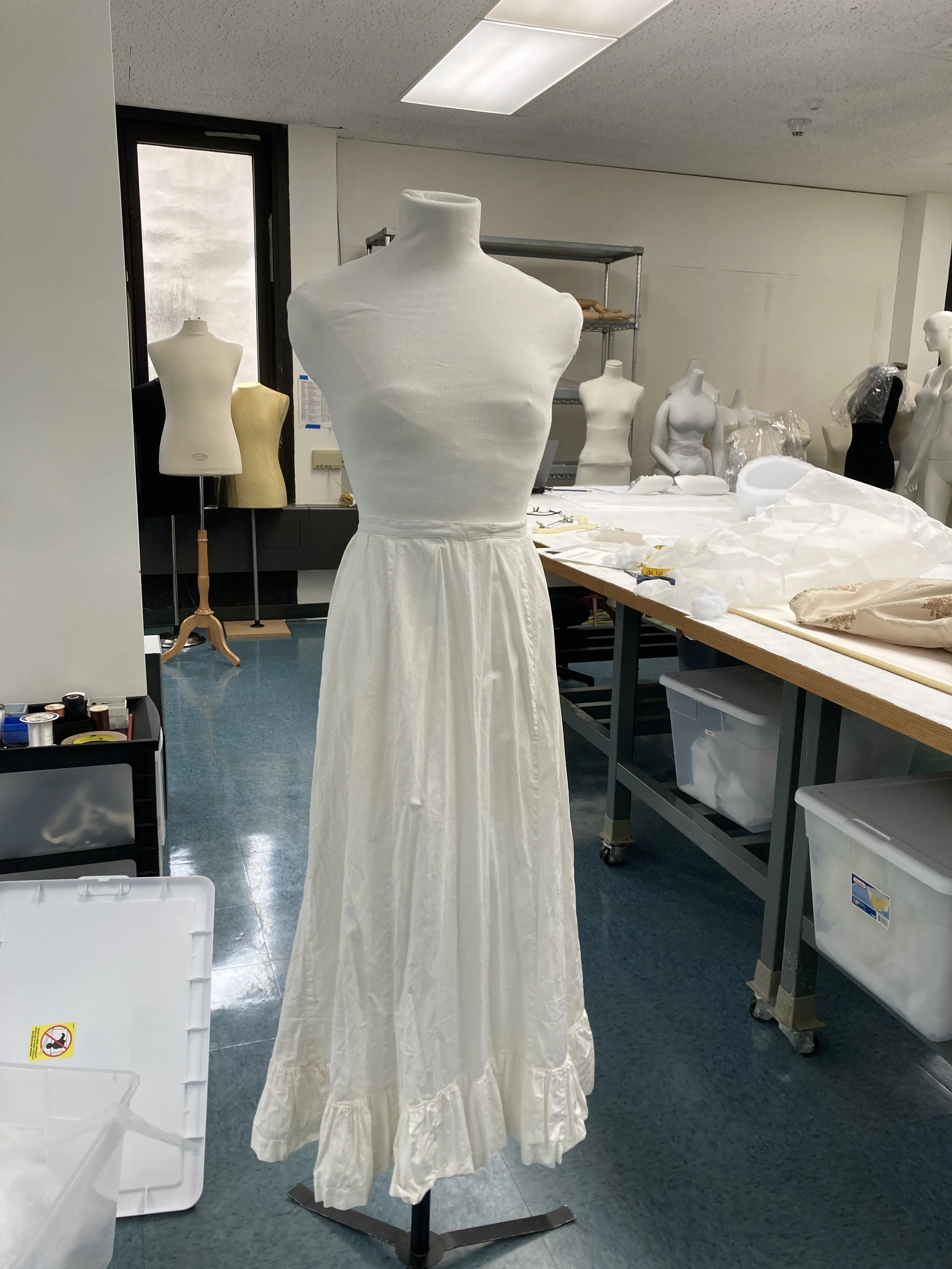 MFIT mounts all of their costume in-house with their large stock of mannequins. The piece is measured and a mannequin/dress form is chosen based on fit and style requirements. This means that often many different types of forms are used in each show. This method allows for very fast dressing of shows, which is important when dressing five costume shows (some with 40+ ensembles) a year.