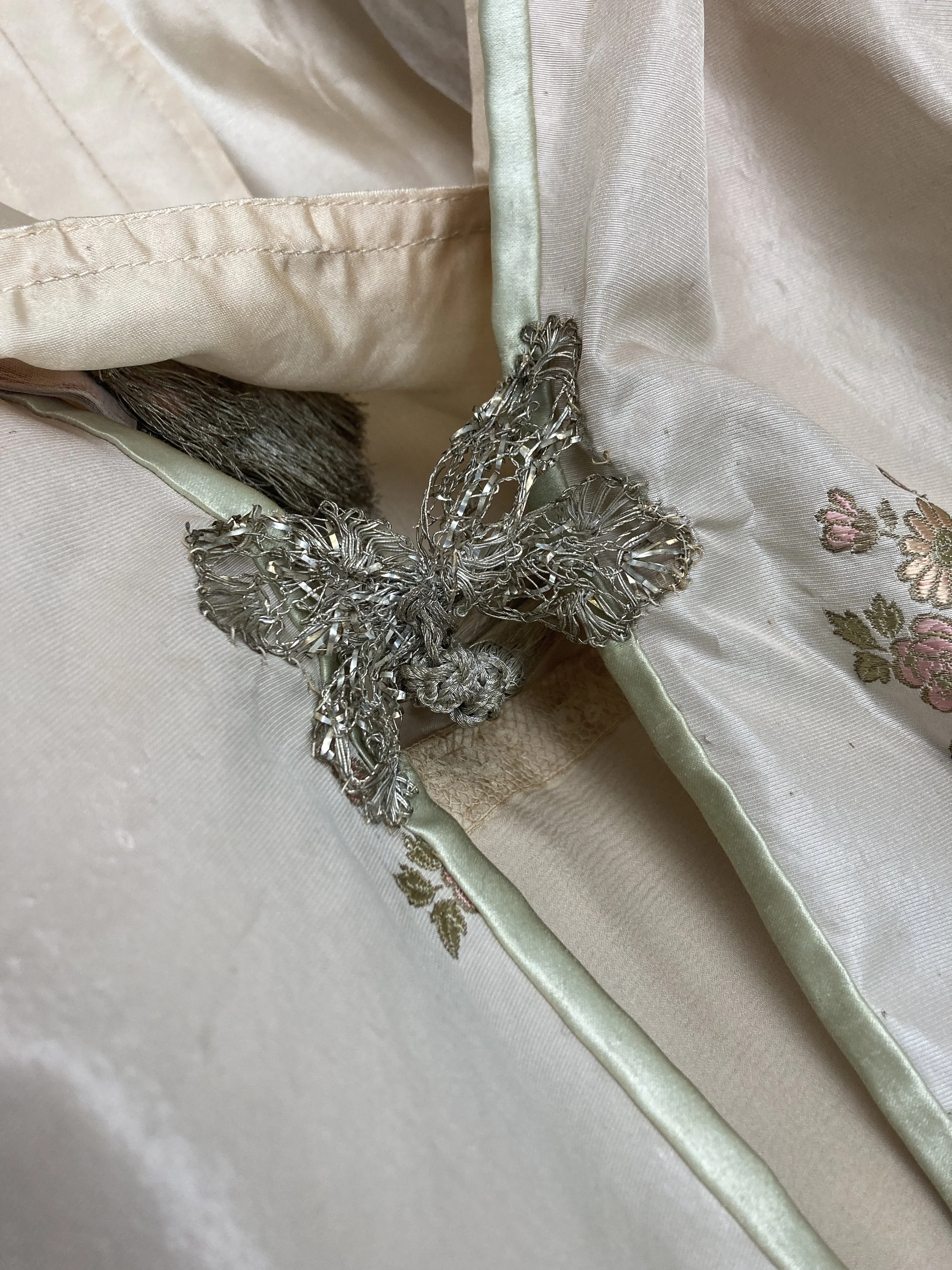 Next, the PL front waistline was addressed. There were multiple splits in the silk brocade and in the silk habouti lining. A patch of silk habotai was cut with pinking shears and placed between the silk lining and brocade. The patch was long enough so that it was folded in half and the fold abutted the waist seam. Herringbone stitches were used to secure the patch to the brocade and the lining separately. Laid and couching stitches were used to consolidate the splits on the brocade. On the lining, a net overlay was placed on the interior, and laid and couching stitches were used to consolidate the splits.