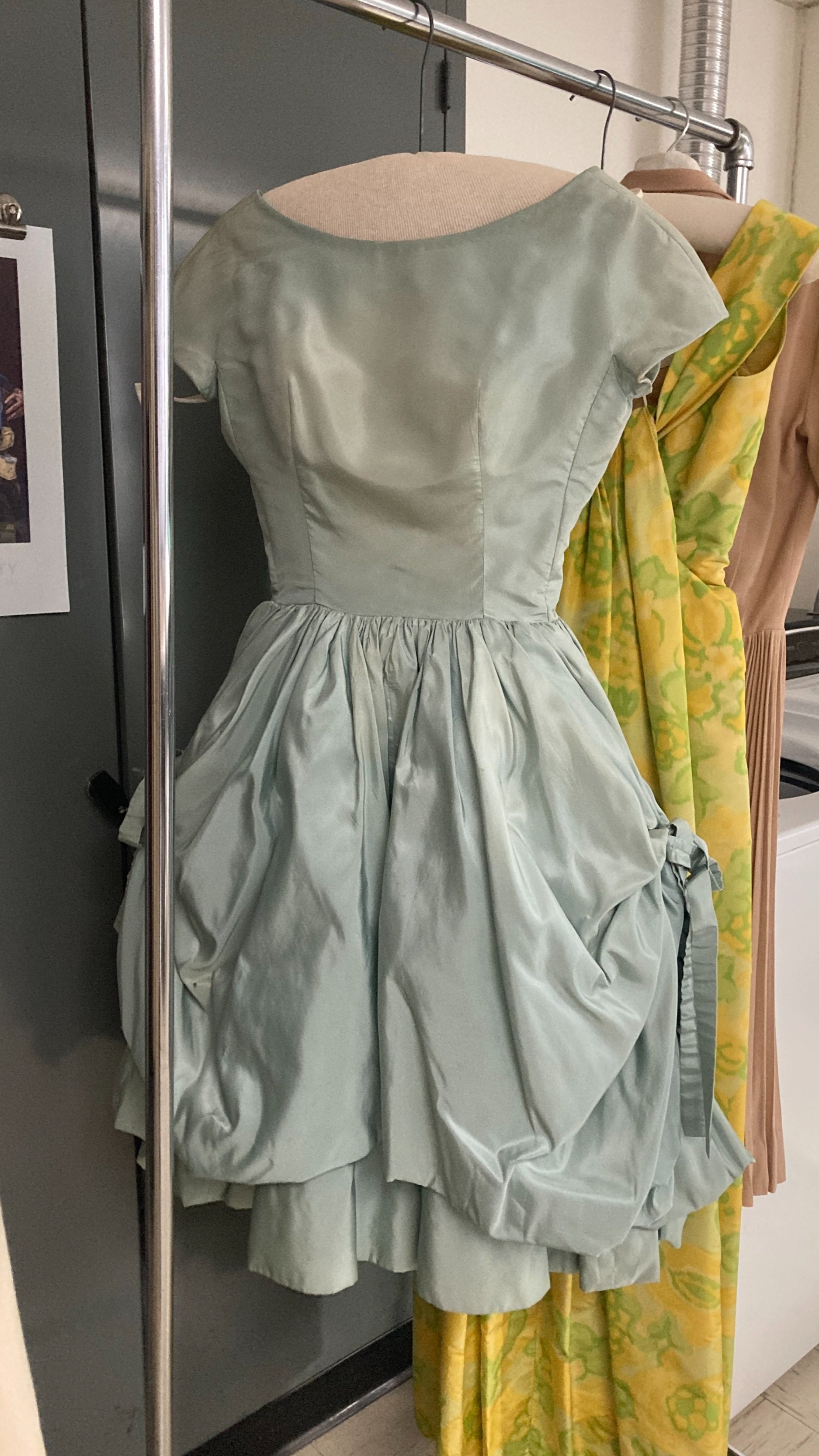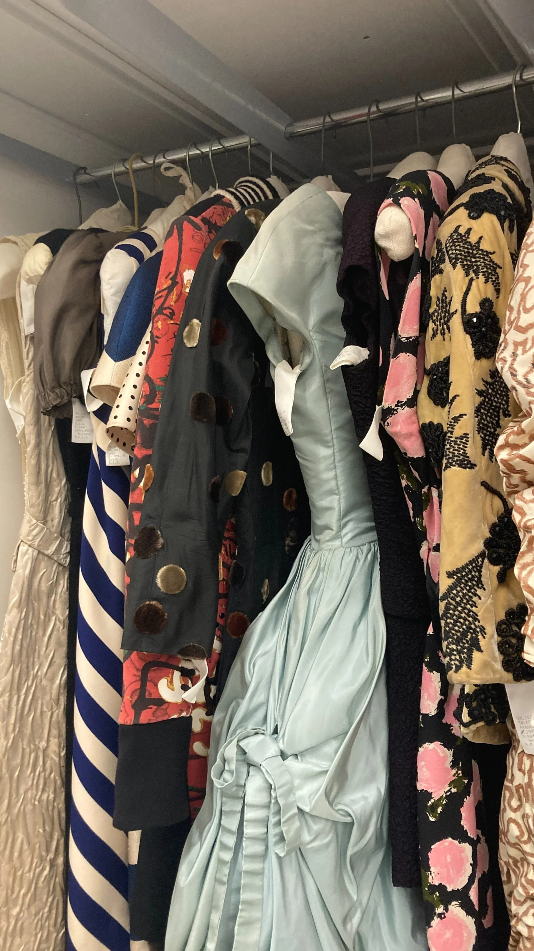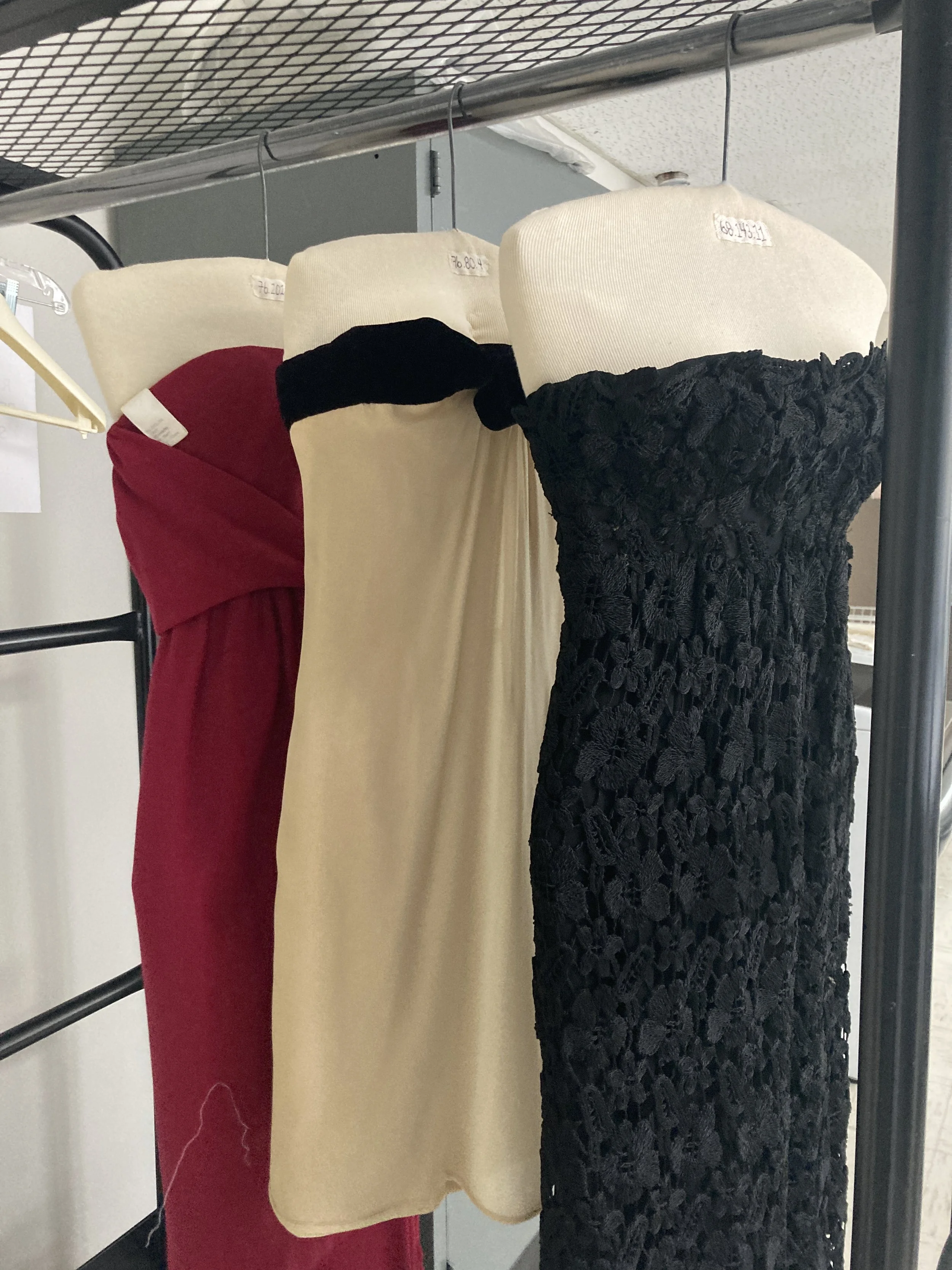 Mid-50s Dior cocktail dress with new hanger back in storage. Photo Credit: Margaret O’Neil