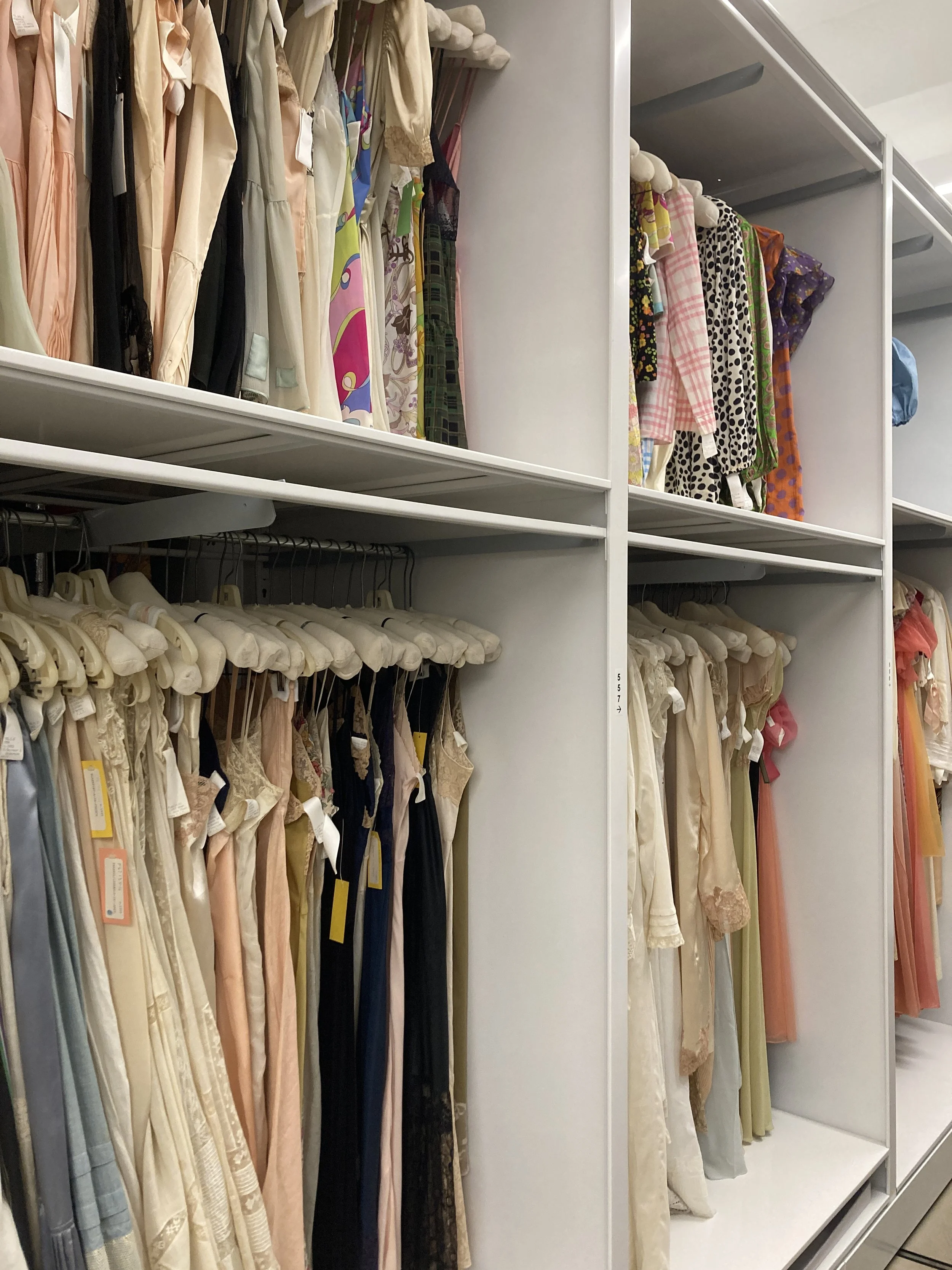 MFIT stores its entire collection onsite in Midtown Manhattan. They have two storage areas plus a small room for the museum’s study collection. Hanging storage is not only a great way to maximize space but it also helps in storing dimensional costumes. There is some flat storage for heavy and/or fragile garments and accessories. This is an important preventive conservation step to ensure the longevity of the collection!