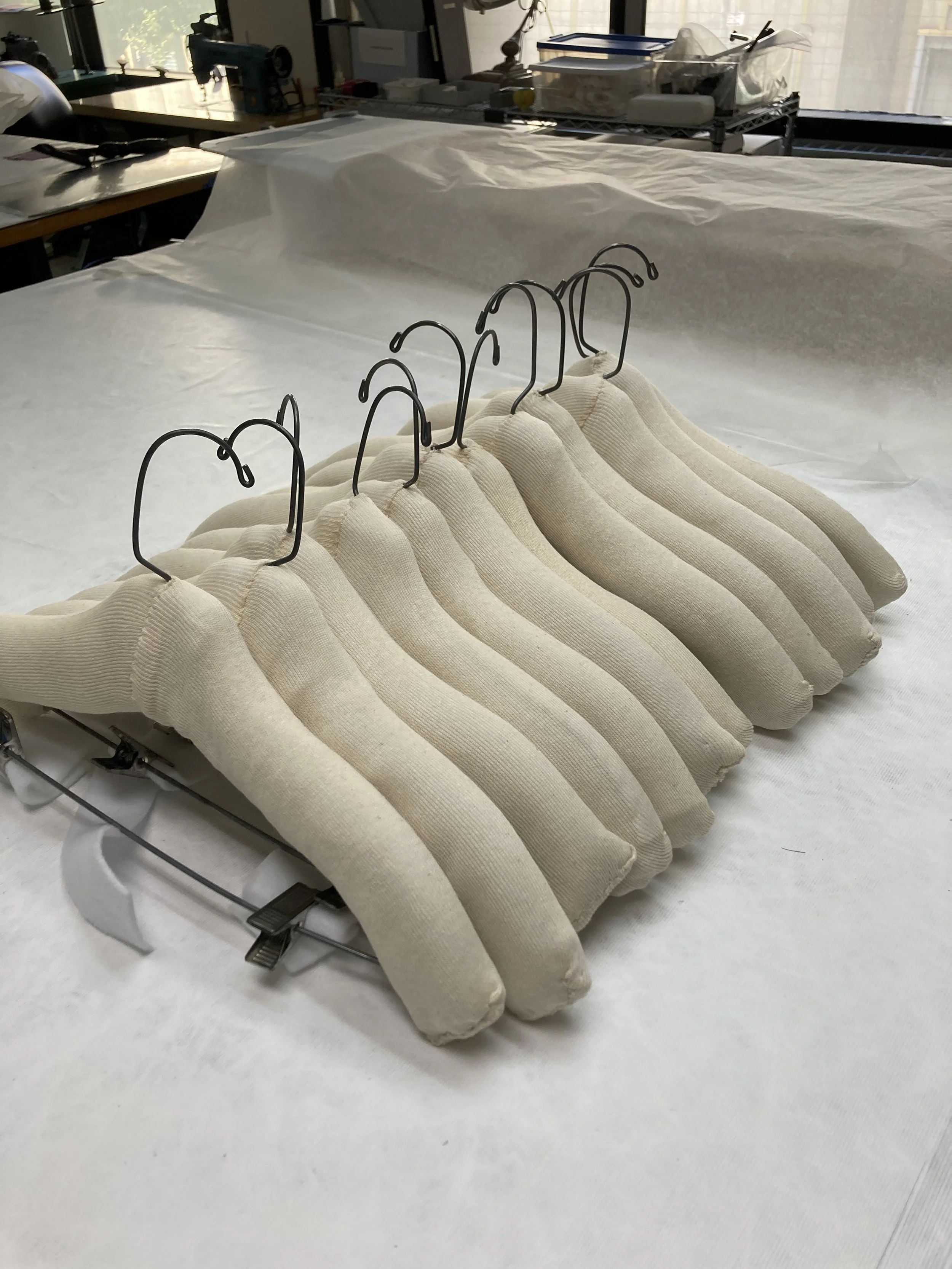 Over the course of my semester internship, I made over one hundred padded hangers in various styles (sloped, men’s, standards, wooden, and clip). These were created by stripping the hangers of any previous material, wrapping and securing polyester felt around each side of the hanger, and covering the hanger with a stockinette or muslin cover.