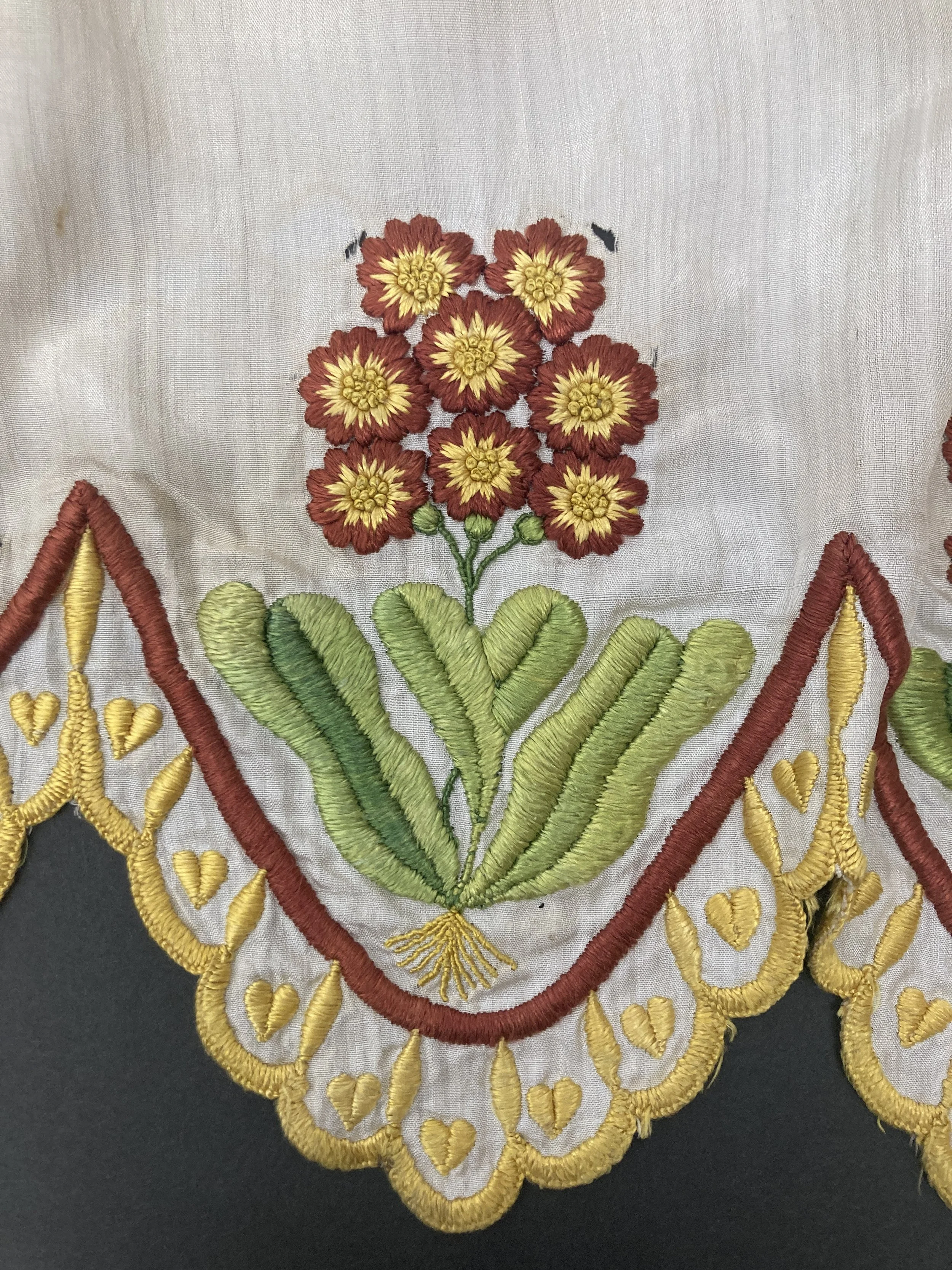 This stunning silk dress with intricate hand done embroidery need a few adhesive patches and a underpinnings for display.